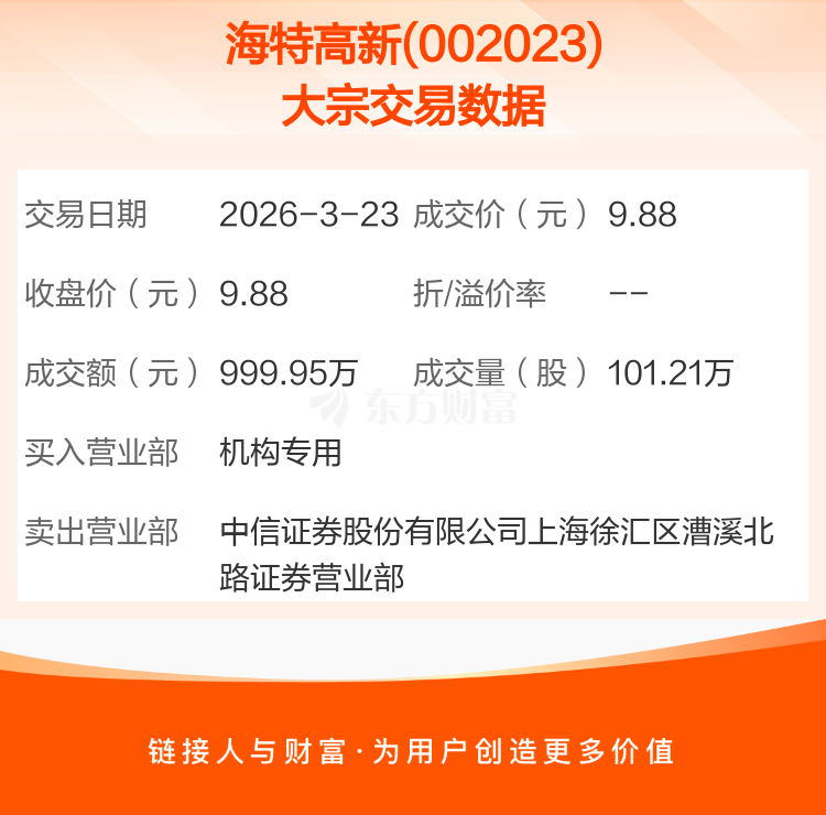 2026年3月23日,海特高新发生1笔大宗交易,共成交101.21万股,成交金额999.95万元,占其流通市值比例为0.14%。
