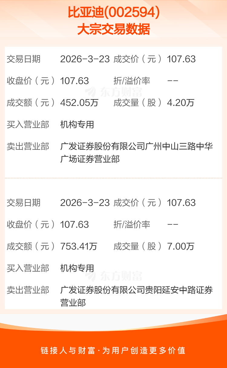 2026年3月23日,比亚迪发生2笔大宗交易,共成交11.20万股,成交金额1205.46万元。