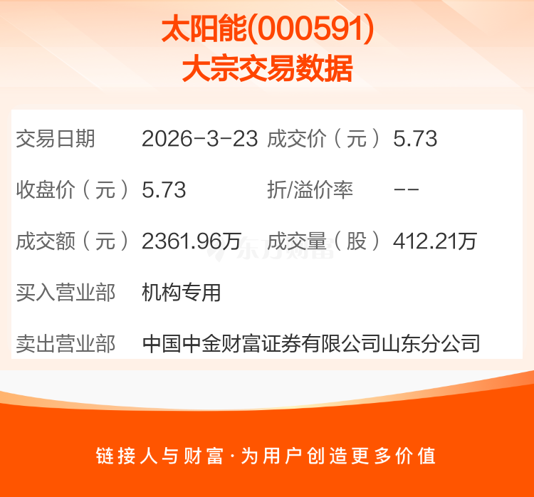 2026年3月23日,太阳能发生1笔大宗交易,共成交412.21万股,成交金额2361.96万元,占其流通市值比例为0.11%。