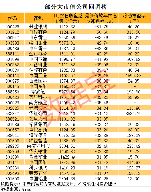 还有哪些大市值个股股价出现了大幅回调?数据显示,1月29日收盘总市值超过千亿元的个股中,有29股最新价较年内高点回调超30%。其中,山东黄金、洛阳钼业、中金黄金等个股回调均超40%。