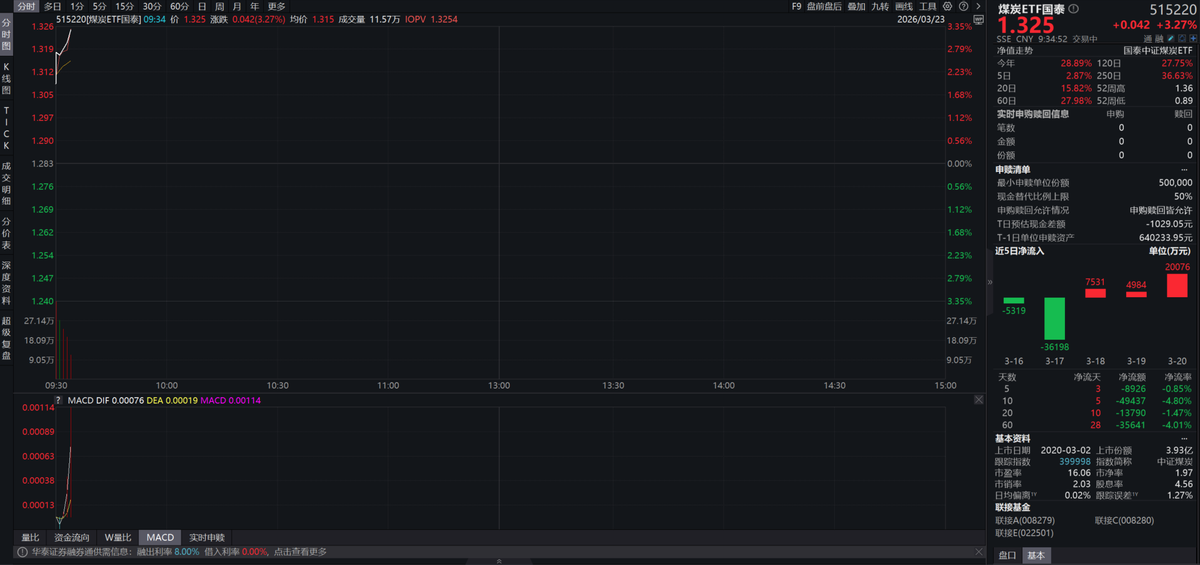 3月23日,煤炭ETF国泰(515220)盘中大涨3%,作为全市场唯一相关标的,是把握本轮能源联动的核心工具。
