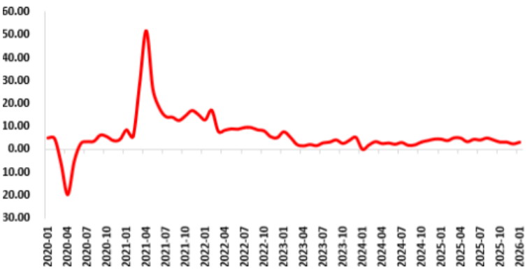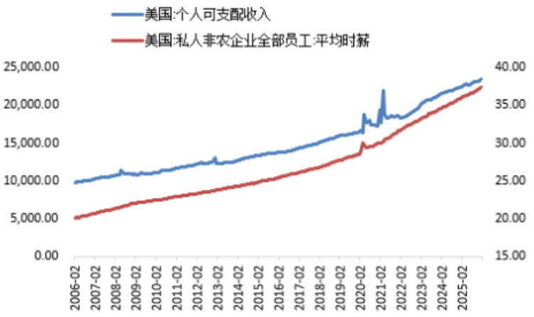 根据美国经济分析局公布的数据,截至2026年1月,美国个人可支配收入为23.47万亿美元,相较20年前增幅为141.2%,美国非农人口平均时薪增长水平与个人可支配收入同样保持稳定上涨,但过去20年累计增幅仅为86.2%,低于个人可支配收入的增幅。美国居民薪资占家庭可支配收入约70%,是日常消费(衣食住行、服务)的直接资金来源。薪资增长直接提升当期购买力,更强化“未来收入可持续”的预期;反之,薪资停滞或失业风险上升,会立即触发预防性储蓄、压制消费意愿。