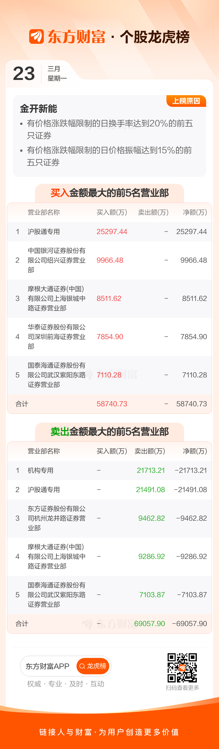 交易所2026年3月23日公布的交易公开信息显示,金开新能因成为有价格涨跌幅限制的日换手率达到20%的前五只证券、有价格涨跌幅限制的日价格振幅达到15%的前五只证券上榜。金开新能当日收报10.06元,涨跌幅-6.07%,偏离值28.89%,换手率28.89%,成交额61.95亿。