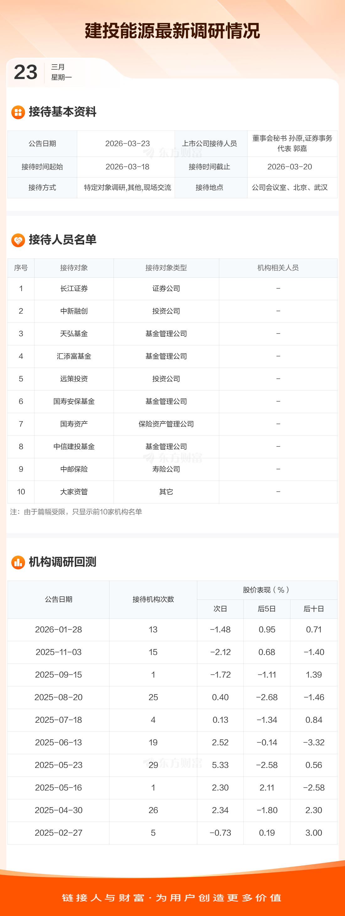 建投能源3月23日公告称,3月18日至3月20日接待长江证券等22家机构调研。接待人员包括董事会秘书 孙原,证券事务代表 郭嘉。