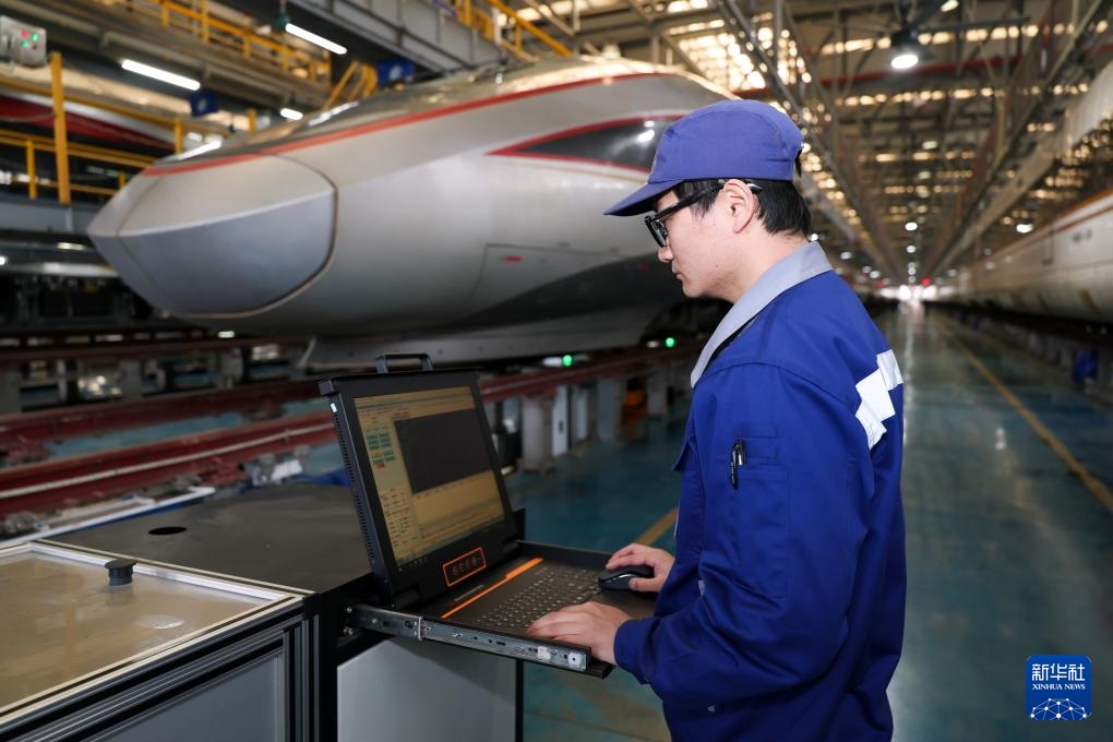 在上海动车段虹桥动车运用所,地勤机械师运用智能化轮辋轮辐超声波探伤机对动车组车轮进行超声波探伤(2026年2月28日)。新华社记者王翔摄