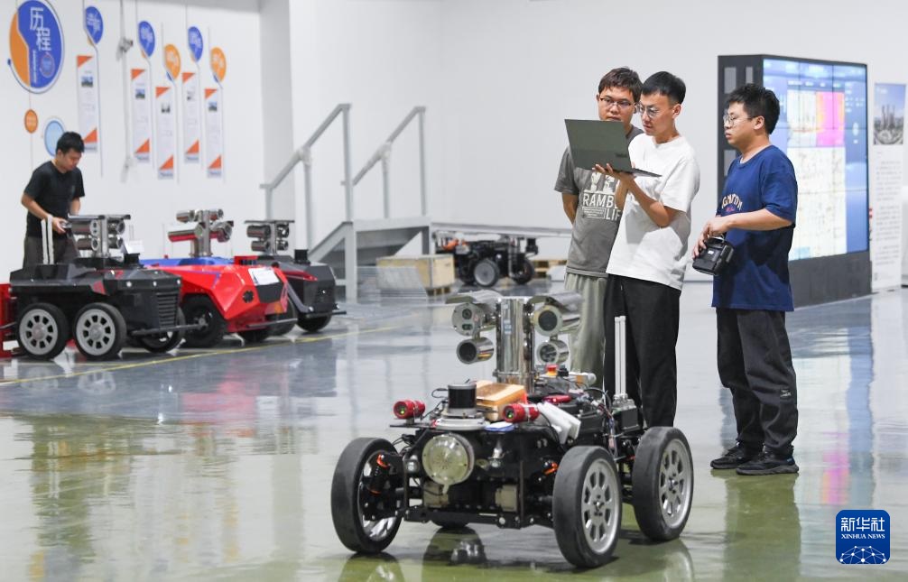 在位于重庆两江新区的七腾机器人有限公司重庆工厂,技术人员在调试防爆轮式机器人(2025年5月27日摄)。新华社记者王全超摄