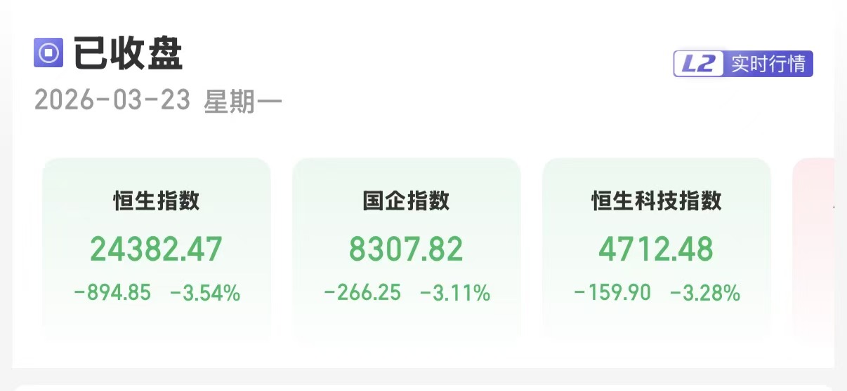 上证报中国证券网讯3月23日,港股三大指数收跌。截至收盘,恒生指数跌3.54%,报24382.47点;恒生国企指数跌3.11%,报8307.82点;恒生科技指数跌3.28%,报4712.48点。