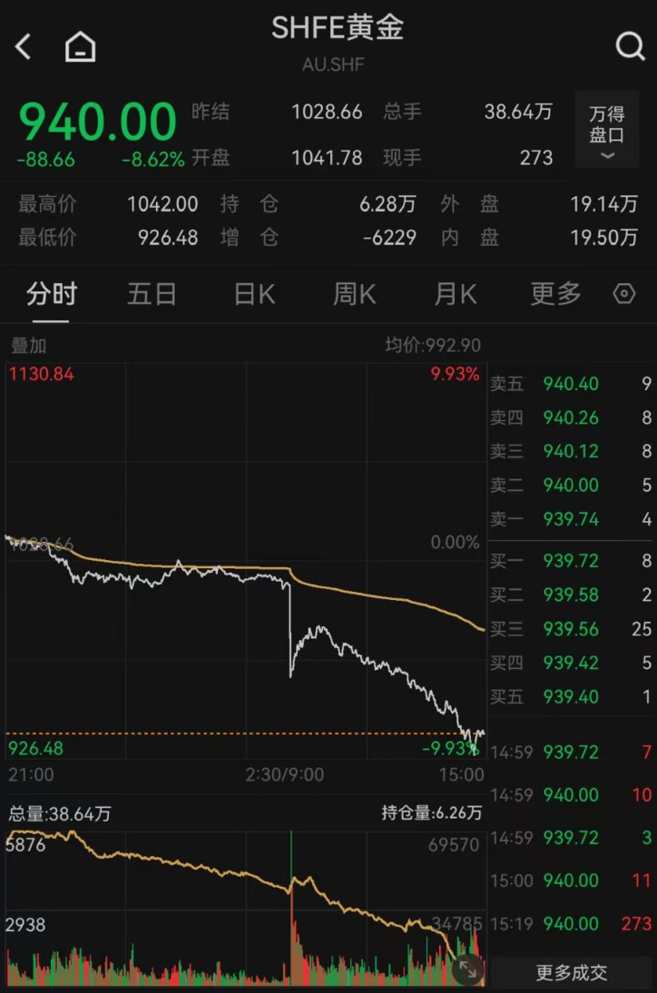 国内金价迅速跌破1000元关口。截至发稿,报940元/克,跌幅超8%。