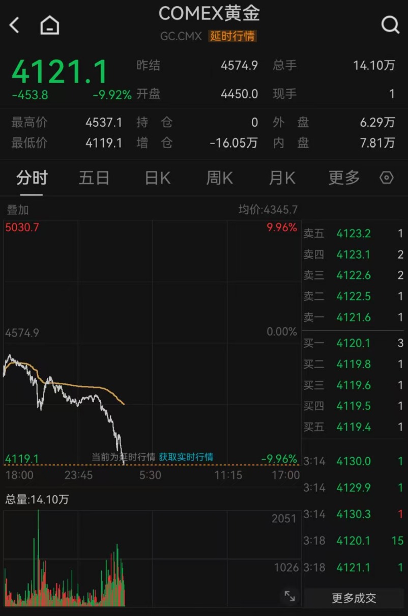 历史罕见!一天之内,黄金接连失守4500、4400、4300、4200、4100美元!“黄金猴市”冲上热搜