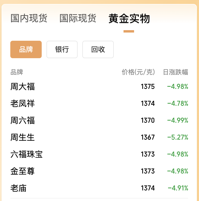 多家首饰品牌进一步下调足金饰品价格,周大福、六福珠宝、老庙黄金等均跌破1400元/克,与1月末1700元/克左右的高位相比,下跌约300元/克。