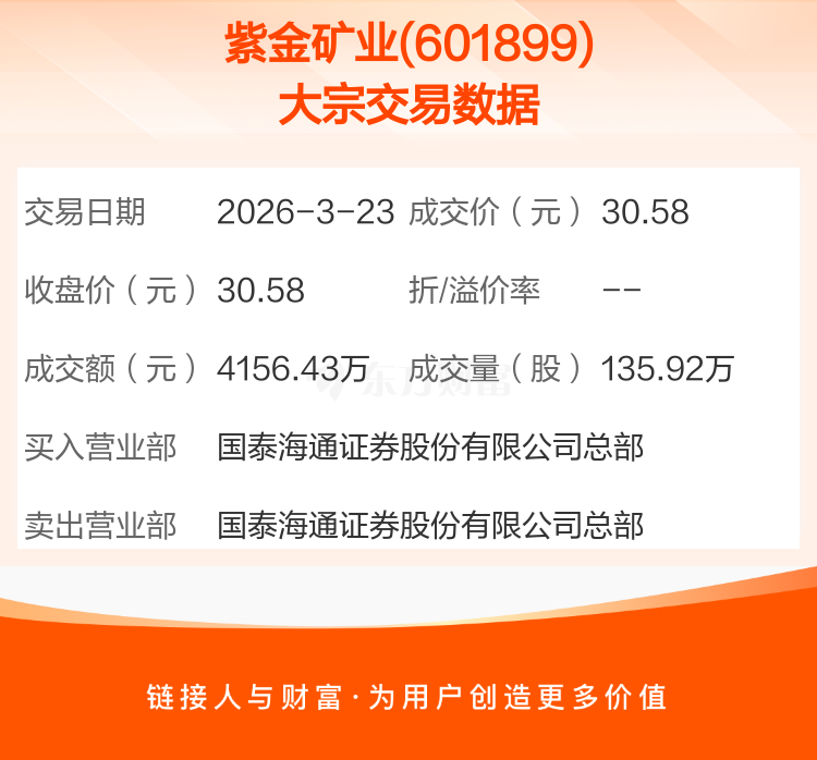 2026年3月23日,紫金矿业发生1笔大宗交易,共成交135.92万股,成交金额4156.43万元。