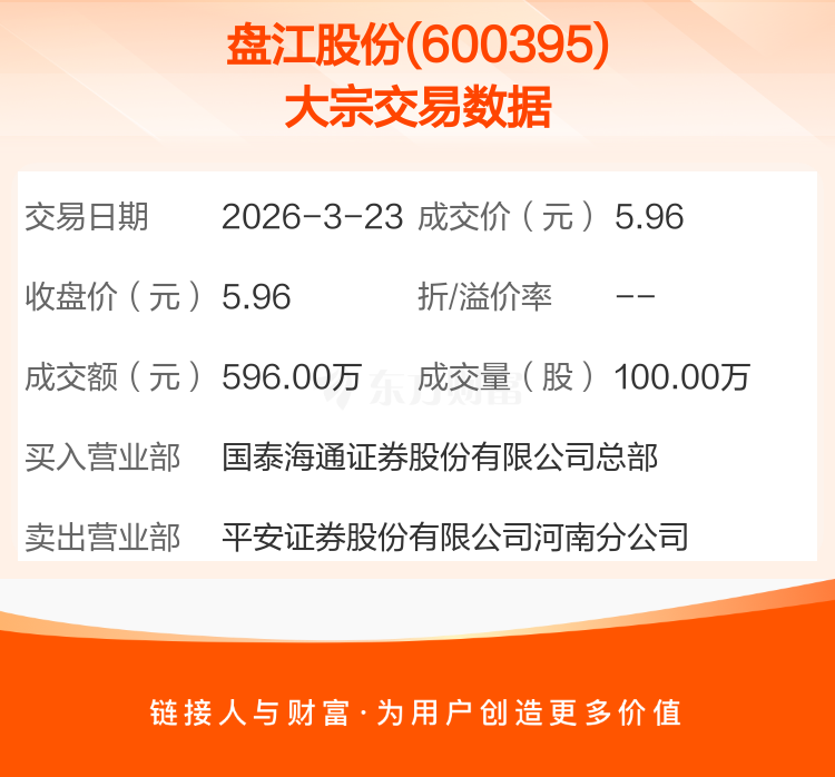 2026年3月23日,盘江股份发生1笔大宗交易,共成交100.00万股,成交金额596.00万元,占其流通市值比例为0.05%。