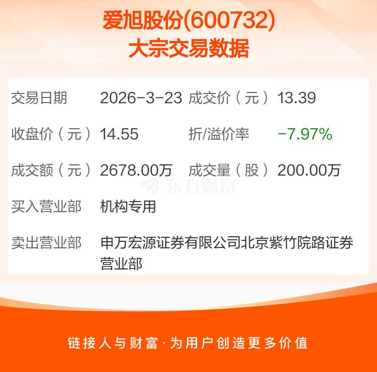 大宗交易:爱旭股份成交2678.00万元,折价7.97%(3-23)