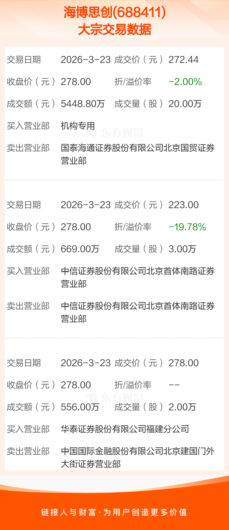 大宗交易:海博思创成交6673.80万元,折价3.97%(3-23)