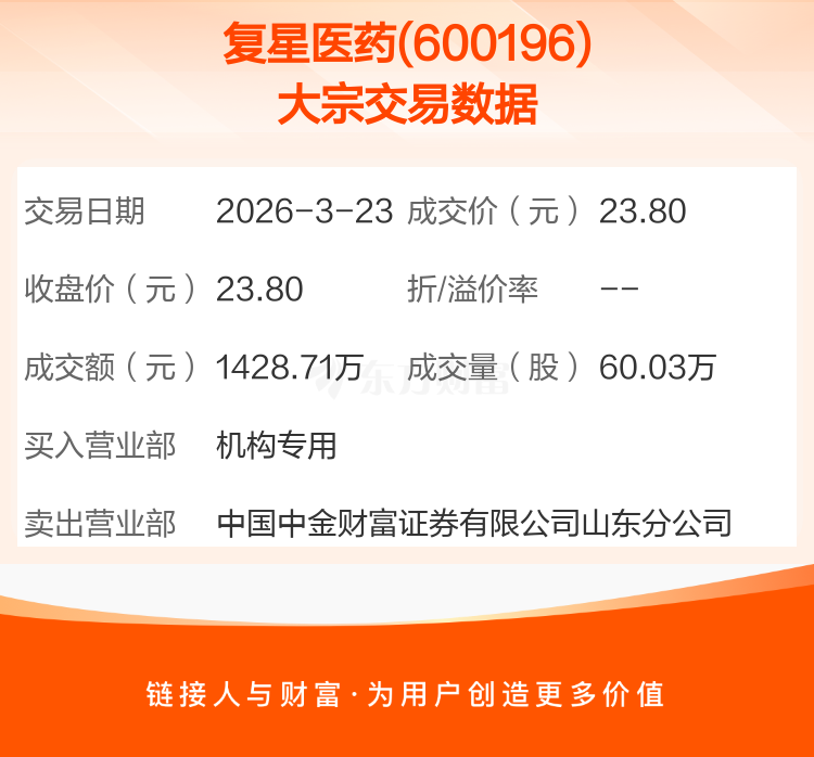 2026年3月23日,复星医药发生1笔大宗交易,共成交60.03万股,成交金额1428.71万元,占其流通市值比例为0.03%。