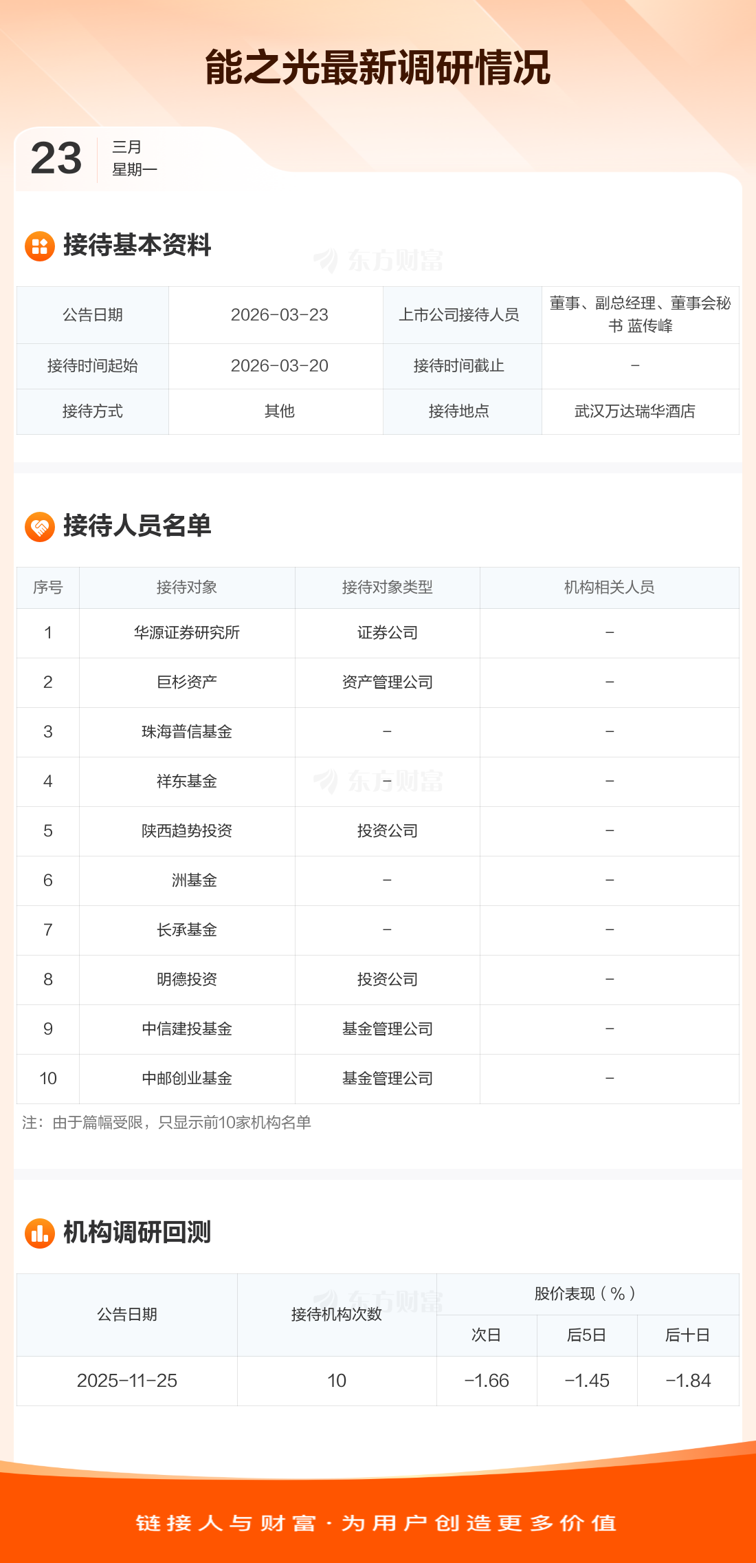 能之光3月23日公告称,3月20日接待华源证券研究所等16家机构调研。接待人员包括董事、副总经理、董事会秘书 蓝传峰。
