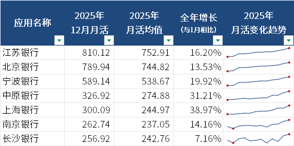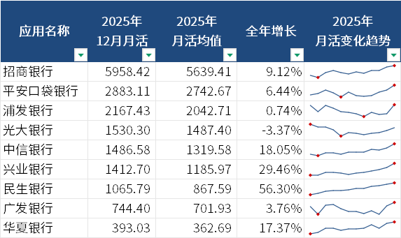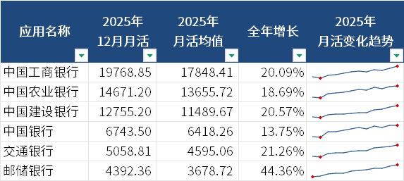 数据显示,至2025年12月,月活在千万量级的手机银行App由12家扩增至13家,民生银行跃升。从数据来看,民生银行尽管全年月活均值仅867.59万,但月活一路上涨,至11月突破1000万,与2025年1月相比,实现56.3%的增长。