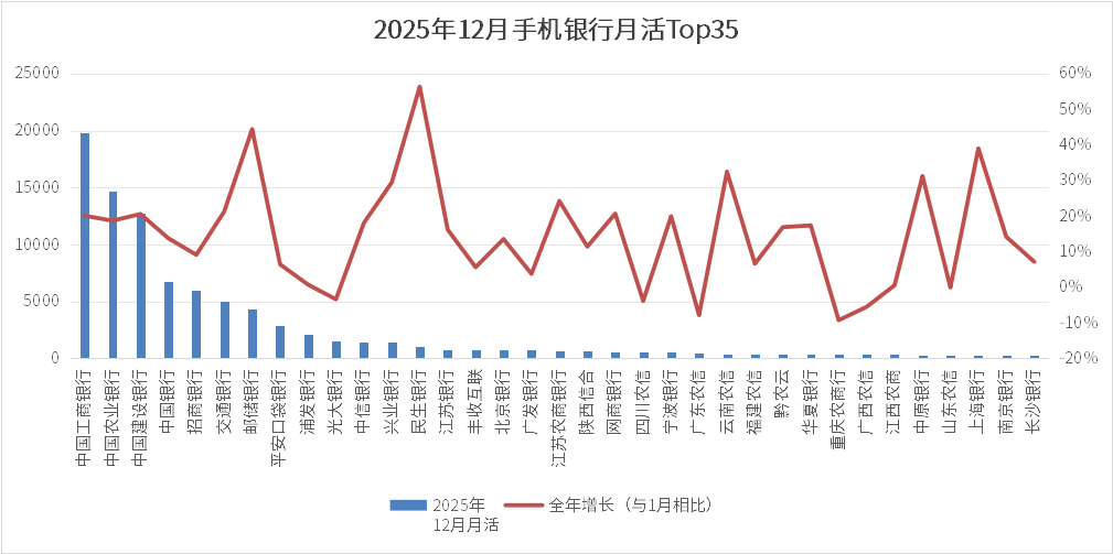 12家股份行中,月活在行业Top35的共9家,其中招商银行位居断层第一,至2025年12月月活接近6000万。