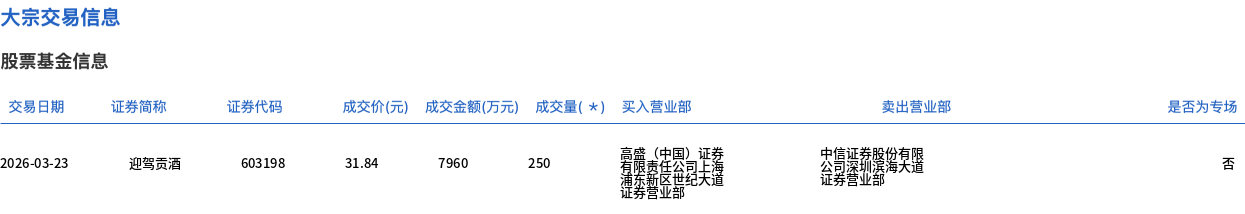 迎驾贡酒今日大宗交易平价成交250万股,成交额7960万元