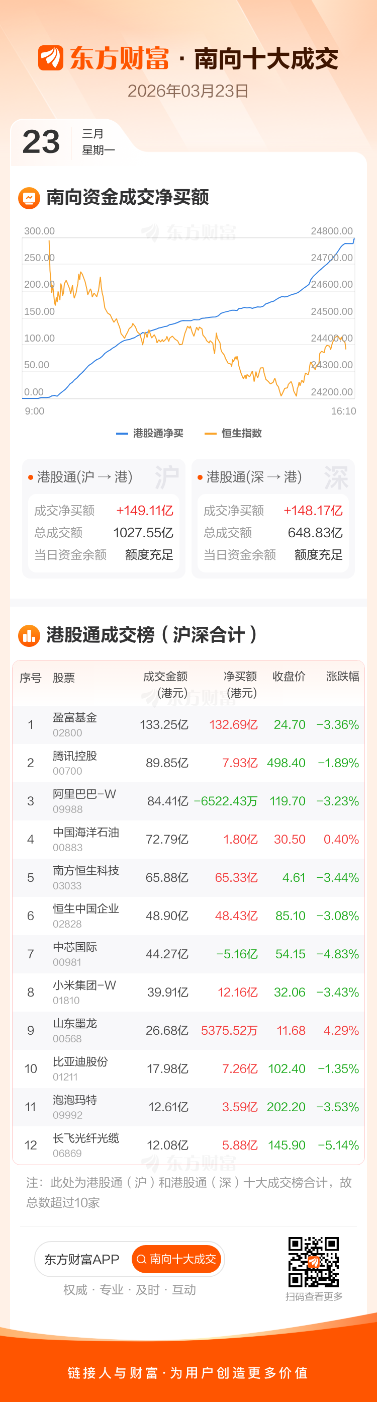 3月23日南向资金净买逾297亿港元,近133亿抢筹盈富基金