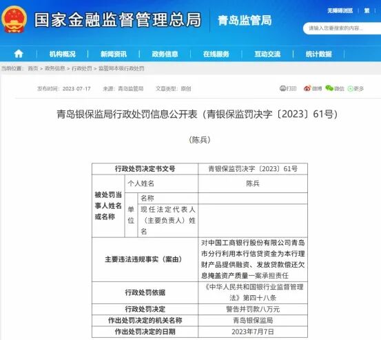 2023年7月,国家金融监管总局公布的行政处罚信息显示,工商银行青岛市分行因利用本行信贷资金为本行理财产品提供融资、发放贷款偿还欠息掩盖资产质量、业务存续期管理不到位导致贷款或理财资金被挪用,被处罚款110万元。