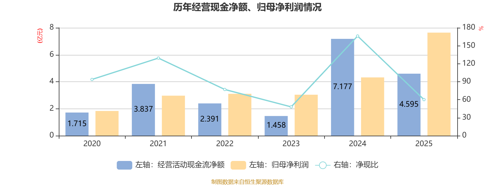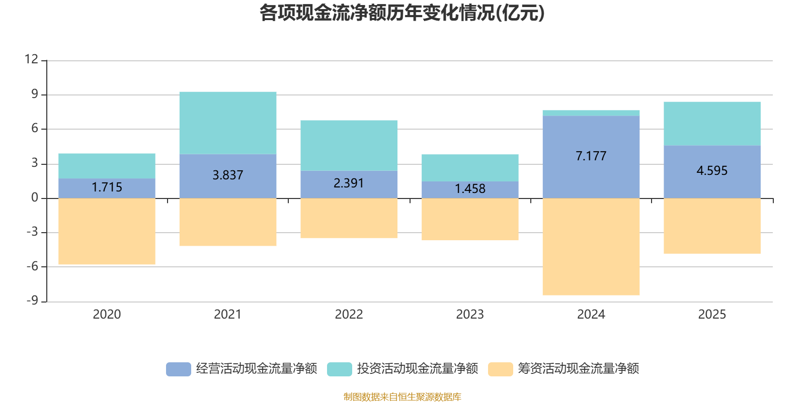 2025年,公司经营活动现金流净额为4.59亿元,同比下降35.98%;筹资活动现金流净额-4.84亿元,同比增加3.62亿元;投资活动现金流净额3.79亿元,上年同期为4790.88万元。