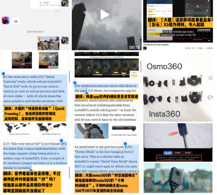 4. GoPro和大疆起诉我们,完全能理解巨头被抢市场的心态。反之,大疆全景相机和拇指相机的很多功能和配件,被媒体报道"copy"/"惊人地相似"(具体见下图)。去年粗略统计一下,对方也会落入我们11件硬件/结构、8件软件方法、6件控制方法、3件配件等专利保护范围,但是我们并没有主动起诉,下面解释为什么;