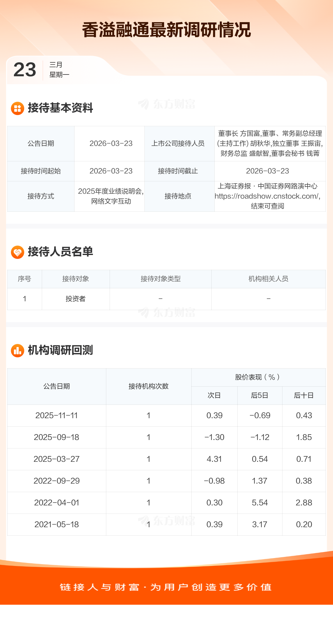 香溢融通3月23日公告称,3月23日接待投资者等1家机构调研。接待人员包括董事长 方国富,董事、常务副总经理(主持工作) 胡秋华,独立董事 王振宙,财务总监 盛献智,董事会秘书 钱菁。