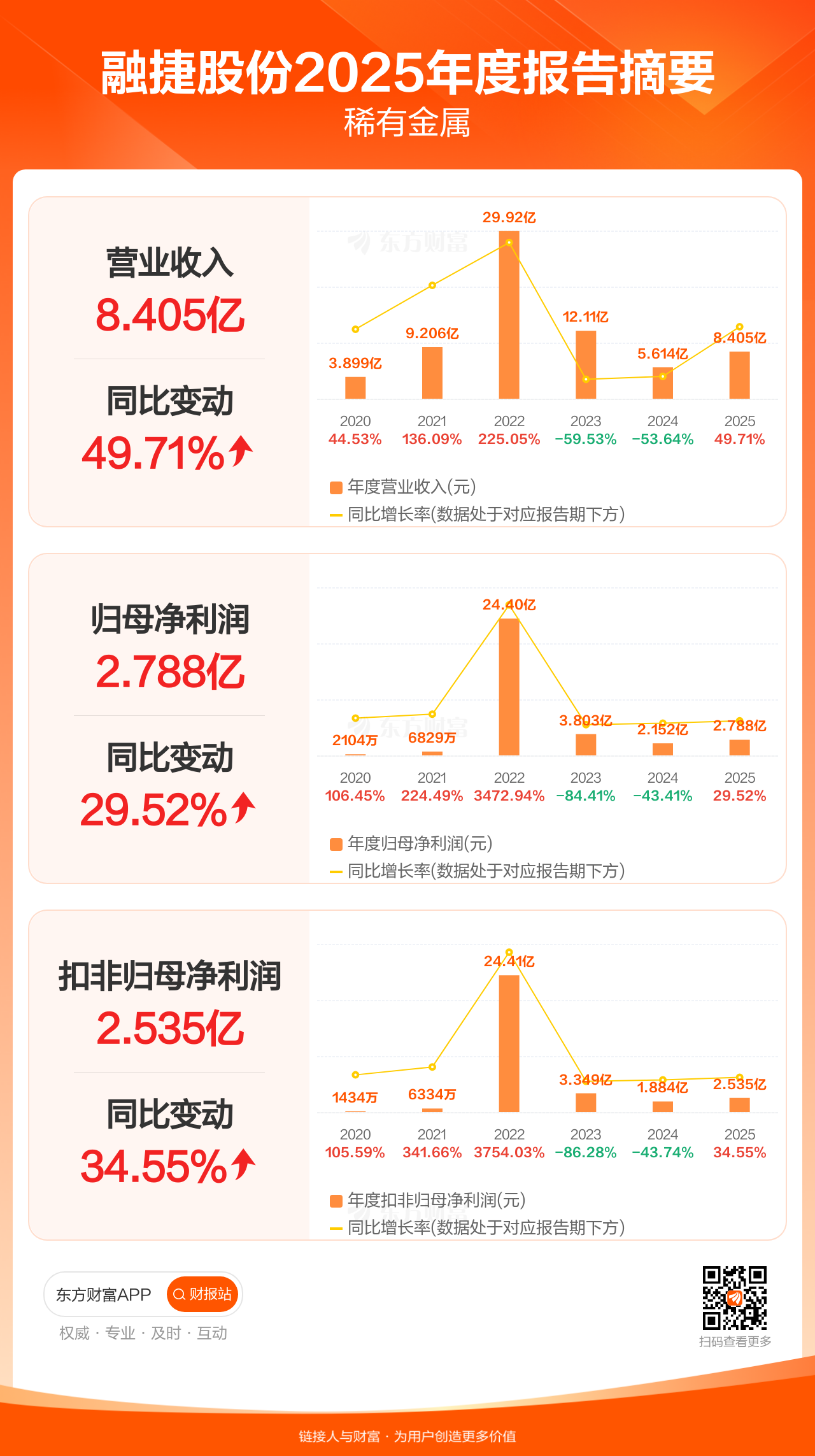 融捷股份3月24日发布2025年年报显示,公司全年实现营业收入8.40亿元,同比增长49.71%;归母净利润2.79亿元,同比增长29.52%;扣非归母净利润2.53亿元,同比增长34.55%。
