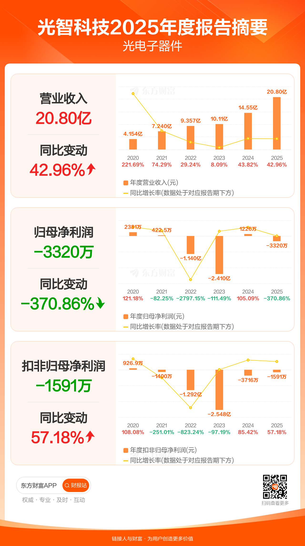 光智科技3月24日发布2025年年报显示,公司全年实现营业收入20.80亿元,同比增长42.96%;归母净利润-3319.97万元;扣非归母净利润-1591.01万元。