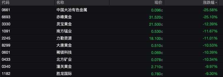 有色金属板块受金价大幅回调至4300美元/盎司下方直接影响。其中赤峰黄金(6693.HK)大跌25.1%,中国大冶有色金属(0661.HK)下跌25.58%。