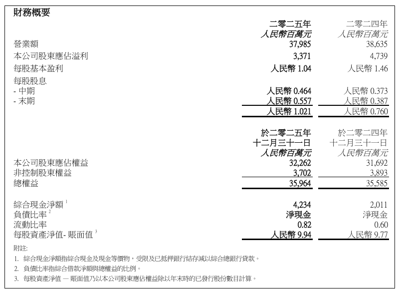 3月23日,华润啤酒(控股)有限公司(华润啤酒,00291.HK)披露截至2025年12月31日止年度的末期业绩,2025年,集团综合营业额为379.85亿元,同比下降1.68%;股东应占溢利为33.71亿元,同比下降28.87%;拟派末期股息每股0.557元。