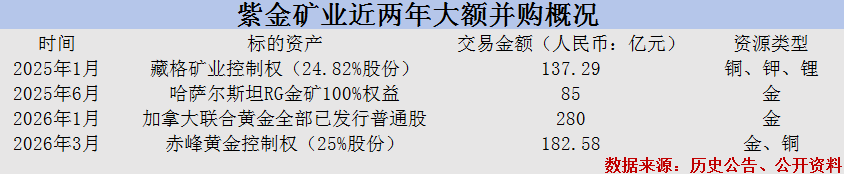 从2025年投入137亿元溢价收购藏格矿业控制权,到今年1月斥资约280亿元并购加拿大矿企联合黄金,再到这次182亿元入主赤峰黄金。