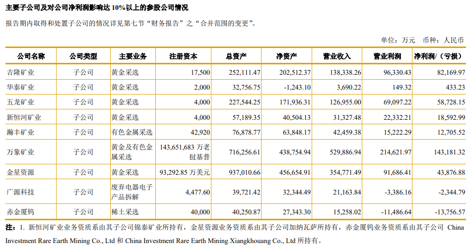 该公司,旗下运营6座黄金矿山及1座多金属矿山,业务覆盖中国、东南亚及西非等国家和地区,境外重要子公司主要来自于老挝万象矿业(主营黄金采选及铜金属开采冶炼业务)、加纳瓦萨矿业(主营黄金采选业务)。