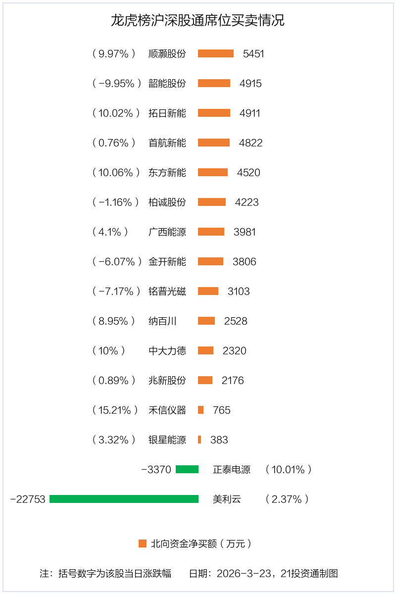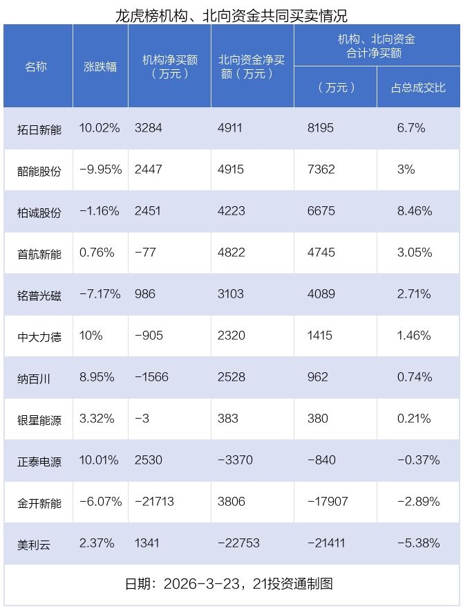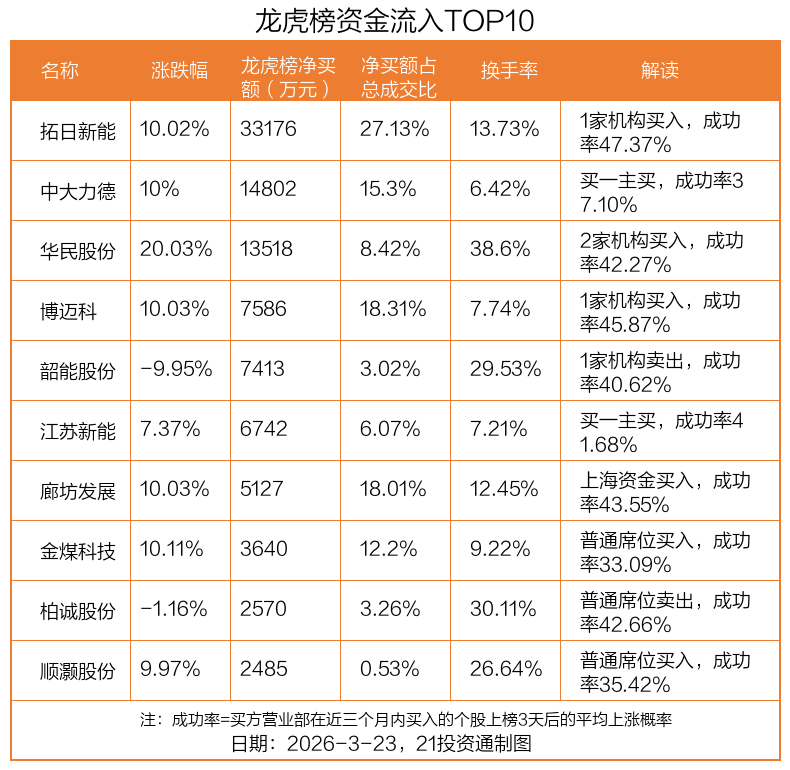 3月23日,上证指数下跌3.63%,深证成指下跌3.76%,创业板指下跌3.49%。盘后龙虎榜数据显示,共有40只个股因当日异动登上龙虎榜,资金净流入最多的是拓日新能(002218.SZ),达3.32亿元。