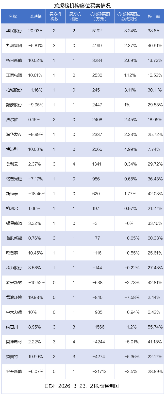 其中,机构净买入金额最多的是华民股份(300345.SZ),当日收盘上涨20.03%,换手率为38.6%。