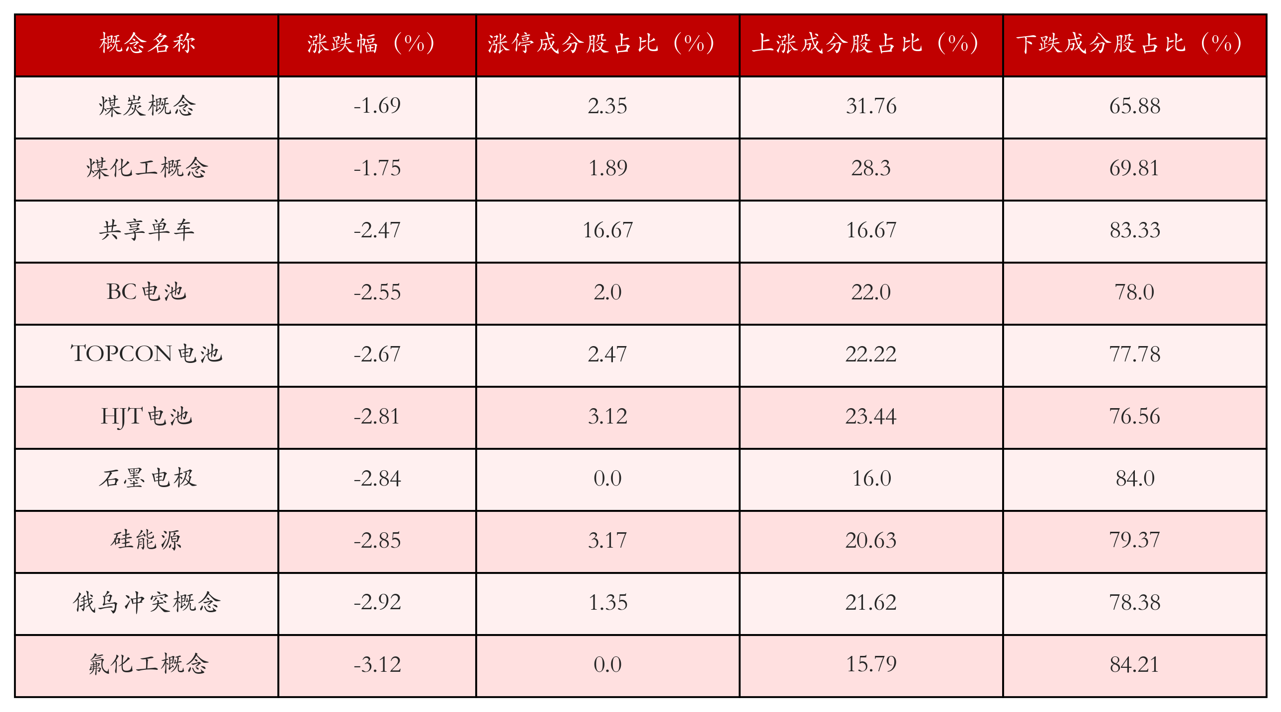 根据A股概念涨跌幅与所对应的股票池综合分析,涨幅靠前的三个概念板块分别为:煤炭概念、煤化工概念与共享单车。排名前10位的概念板块相关数据见下表: