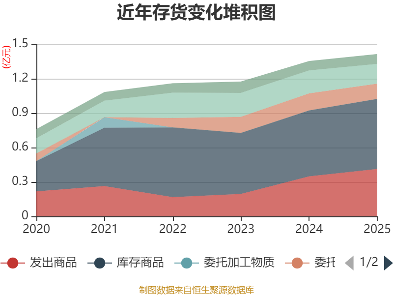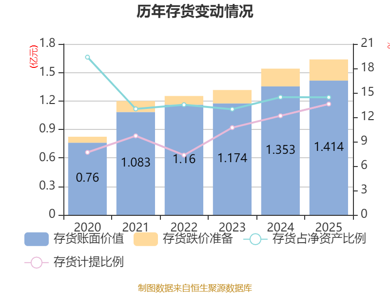 从存货变动来看,截至2025年末,公司存货账面价值为1.41亿元,占净资产的14.44%,较上年末增加614.9万元。其中,存货跌价准备为2229.26万元,计提比例为13.62%。
