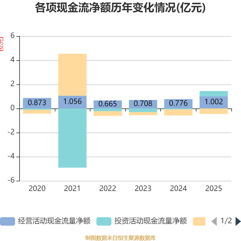 截至2025年,公司经营活动现金流净额为1亿元,同比增长29.04%;筹资活动现金流净额-4538.4万元,同比增加585.6万元;投资活动现金流净额4434.39万元,上年同期为-705.38万元。