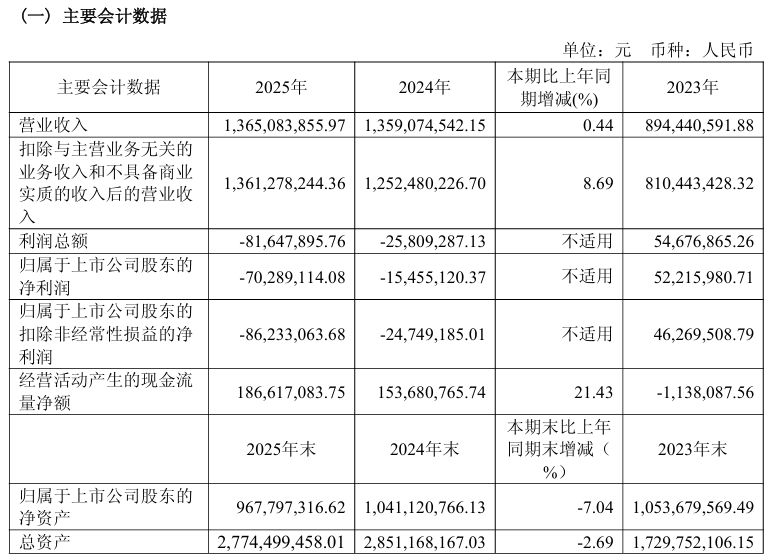 翻阅过往年报,公司自2024年起,净利一直亏损,算上今年已是连亏三年。2024年,公司营收13.59亿元,同比增长51.95%,净利润-1545.51万元,同比下滑129.60%。2025年,公司营收13.65亿元,同比增长0.44%,净利润-7028.91万元,同比下滑354.79%。