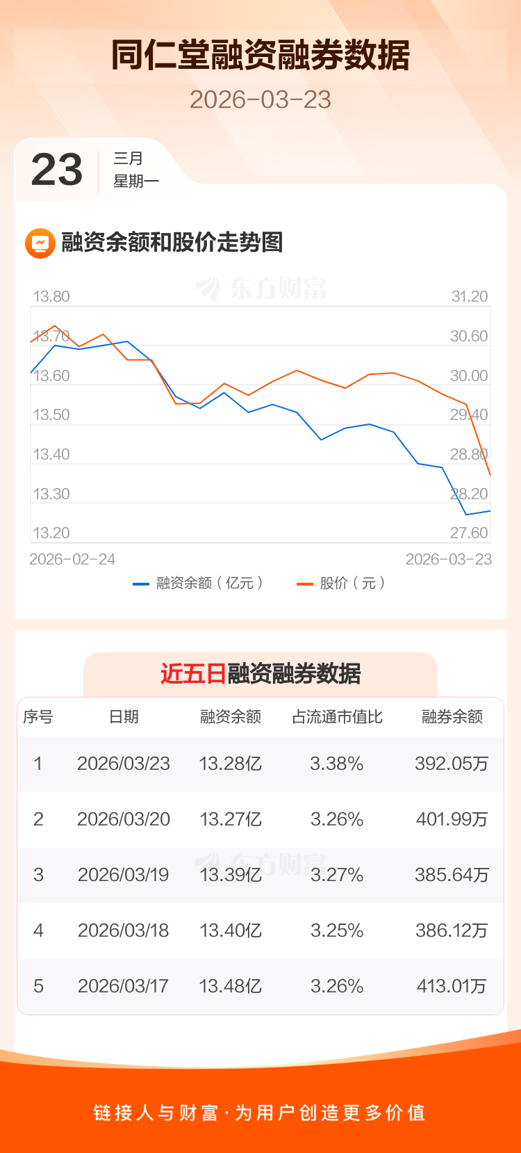 交易所最新数据显示,同仁堂于2026年3月23日获融资买入2912.18万元,融资偿还2828.59万元,当日融资净买入83.59万元。目前,该股融资余额13.28亿,占流通市值比例为3.38%。
