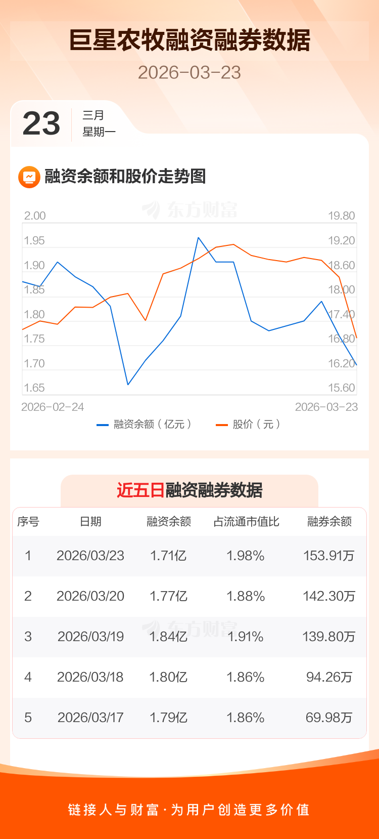 交易所最新数据显示,巨星农牧于2026年3月23日获融资买入2019.13万元,融资偿还2574.95万元,当日融资净偿还555.82万元。目前,该股融资余额1.71亿,占流通市值比例为1.98%。