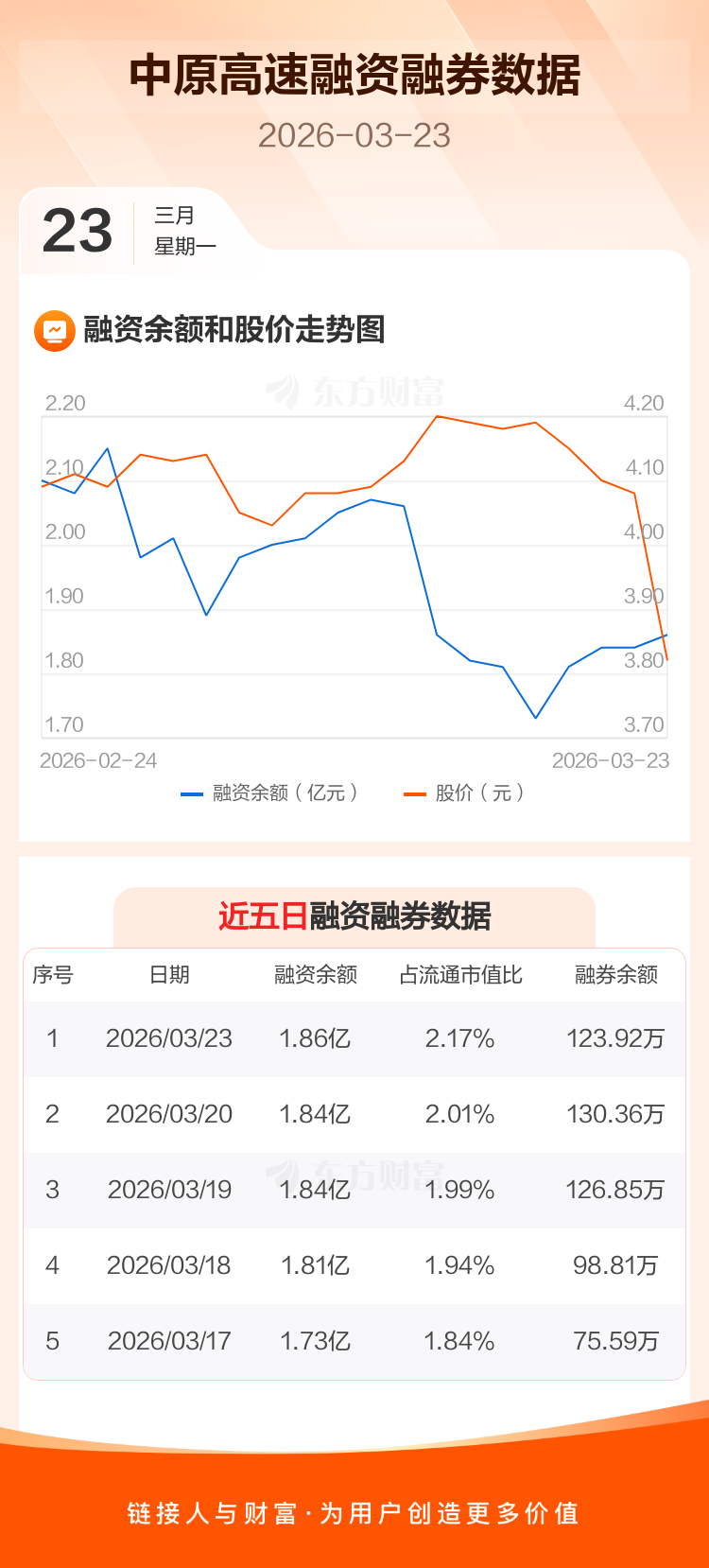 交易所最新数据显示,中原高速于2026年3月23日获融资买入1430.06万元,融资偿还1215.06万元,当日融资净买入215万元。目前,该股融资余额1.86亿,占流通市值比例为2.17%。
