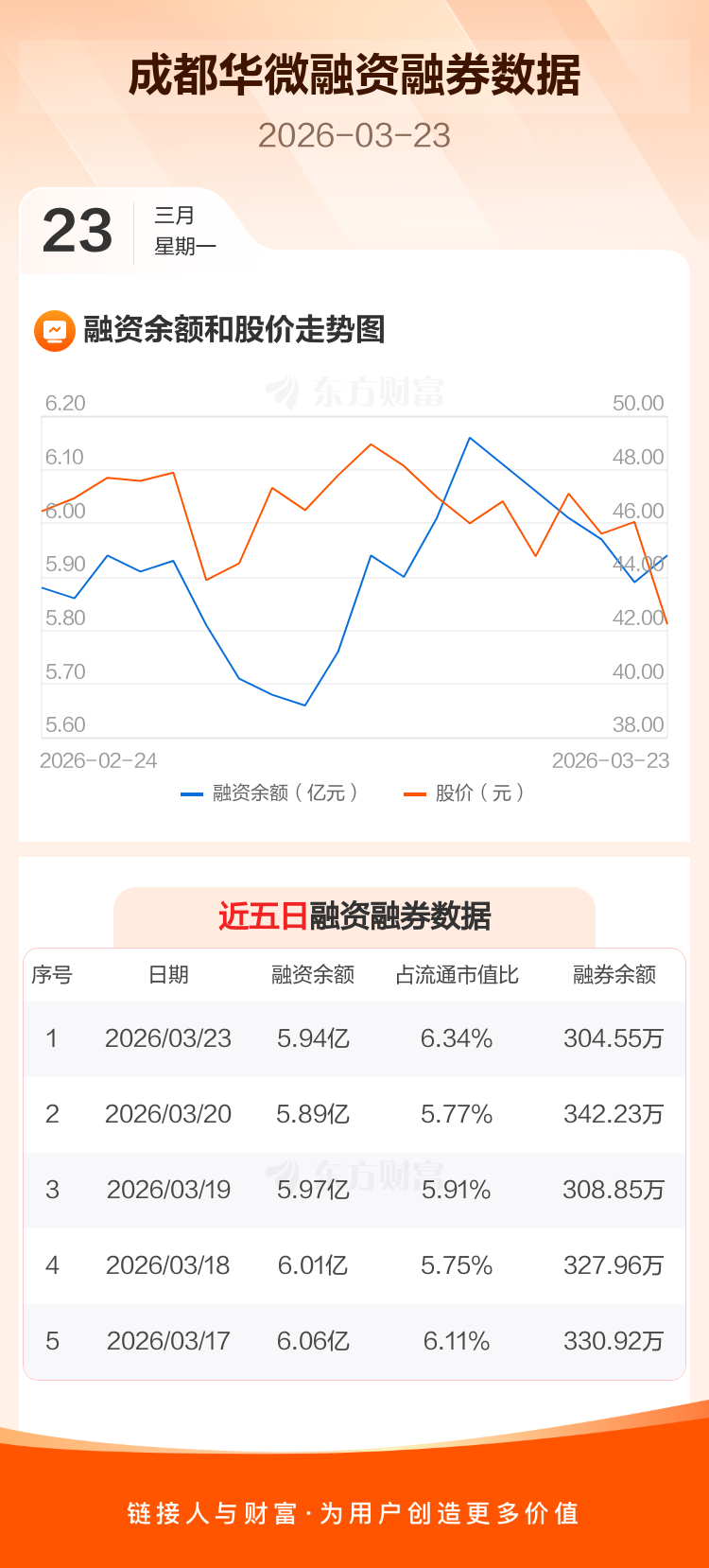 交易所最新数据显示,成都华微于2026年3月23日获融资买入3801.88万元,融资偿还3387.39万元,当日融资净买入414.49万元。目前,该股融资余额5.94亿,占流通市值比例为6.34%。