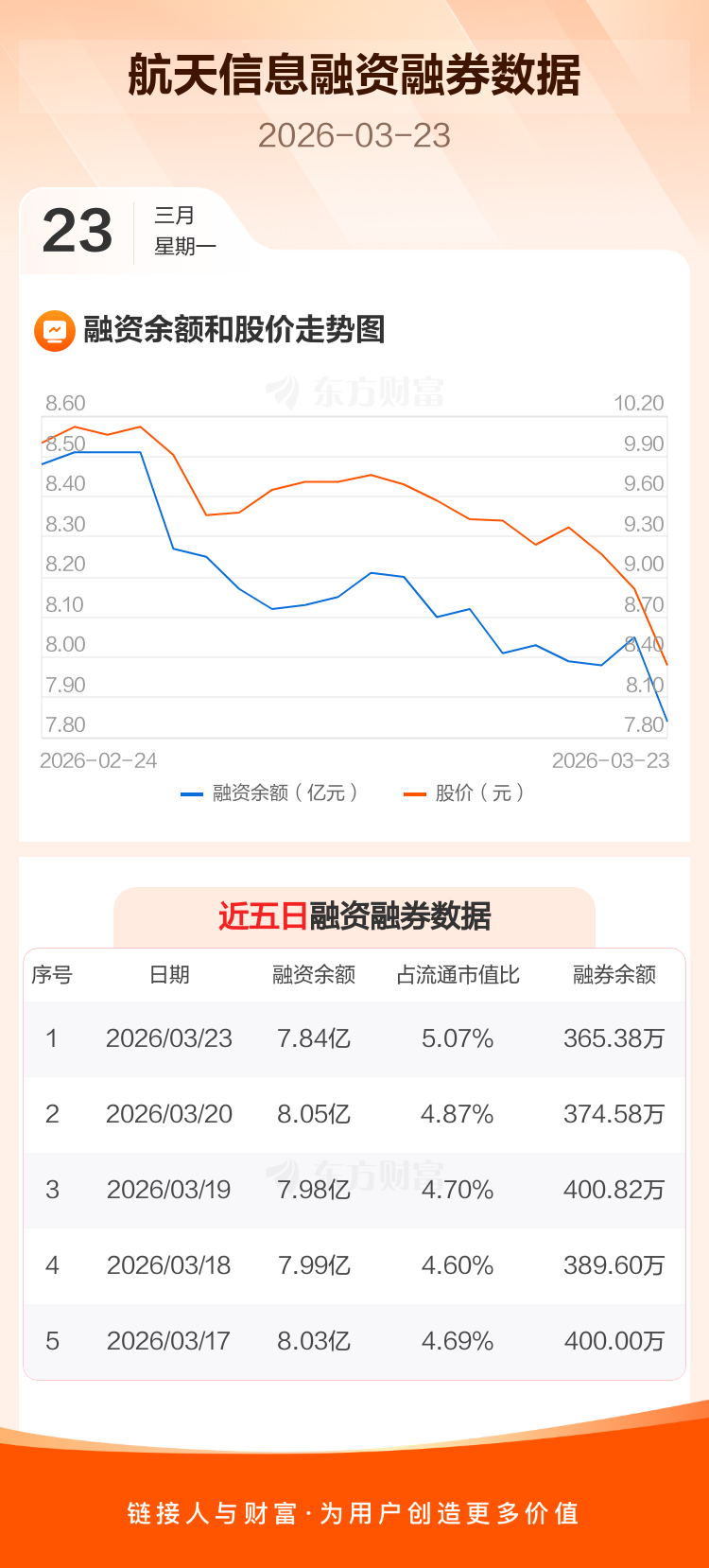 交易所最新数据显示,航天信息于2026年3月23日获融资买入1351.92万元,融资偿还3477.06万元,当日融资净偿还2125.15万元。目前,该股融资余额7.84亿,占流通市值比例为5.07%。