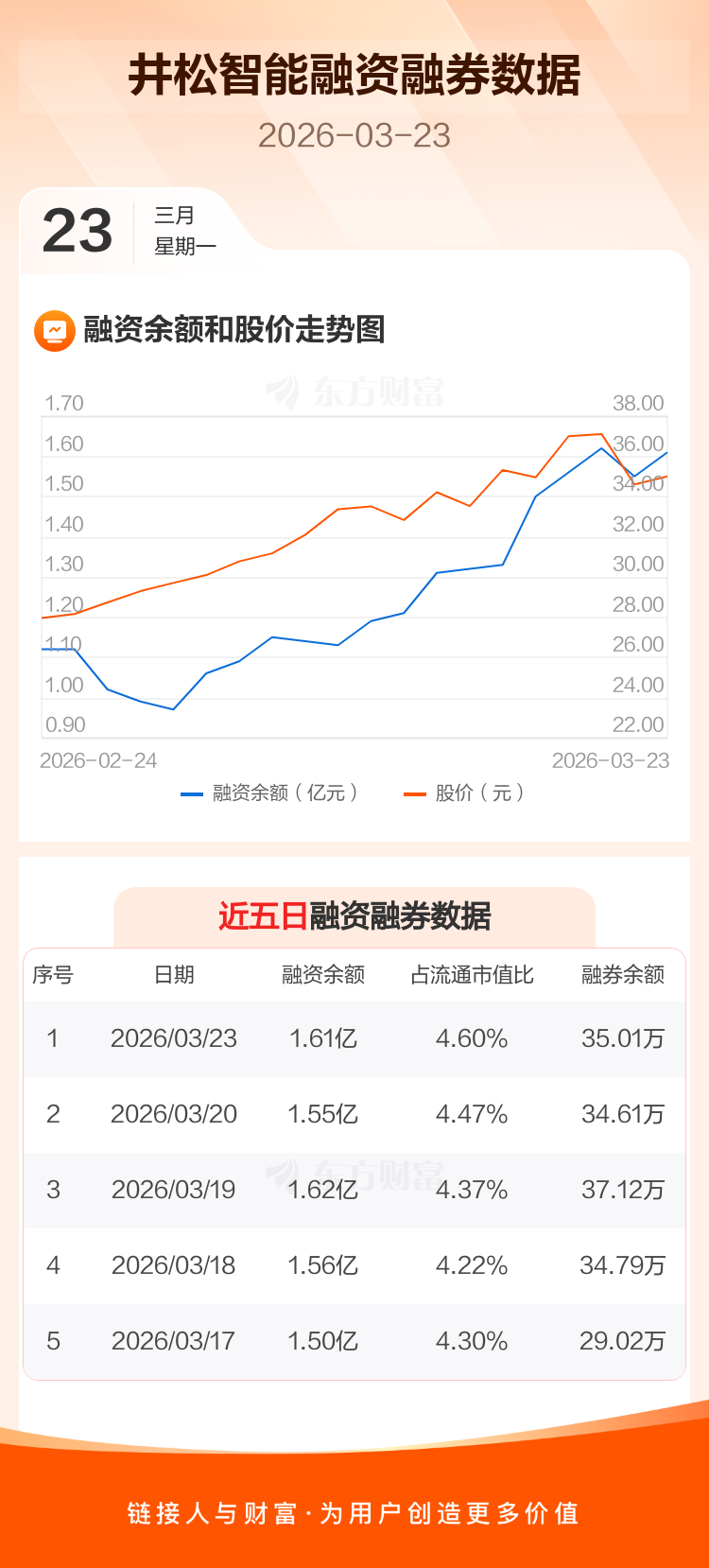 交易所最新数据显示,井松智能于2026年3月23日获融资买入2222.53万元,融资偿还1611.93万元,当日融资净买入610.6万元。目前,该股融资余额1.61亿,占流通市值比例为4.60%。