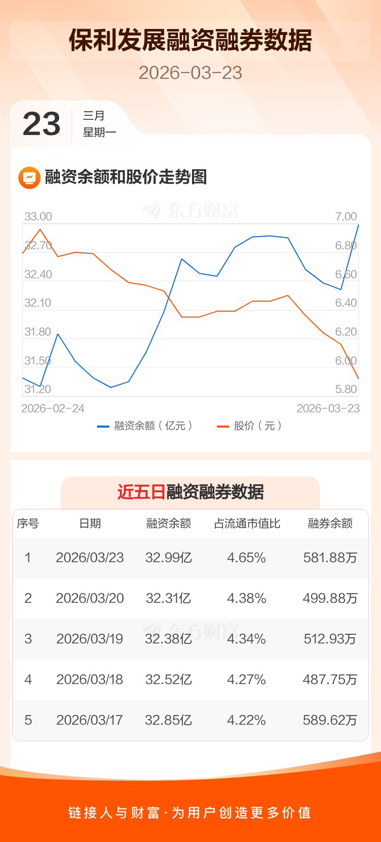 交易所最新数据显示,保利发展于2026年3月23日获融资买入1.56亿元,融资偿还8789.38万元,当日融资净买入6814.8万元。目前,该股融资余额32.99亿,占流通市值比例为4.65%。