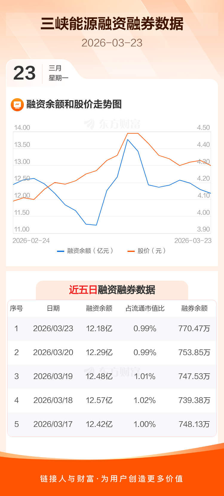 交易所最新数据显示,三峡能源于2026年3月23日获融资买入1.24亿元,融资偿还1.36亿元,当日融资净偿还1186.42万元。目前,该股融资余额12.18亿,占流通市值比例为0.99%。