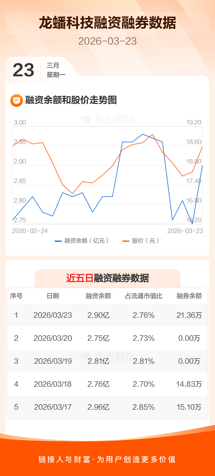 交易所最新数据显示,龙蟠科技于2026年3月23日获融资买入4203.42万元,融资偿还2728.52万元,当日融资净买入1474.9万元。目前,该股融资余额2.90亿,占流通市值比例为2.76%。