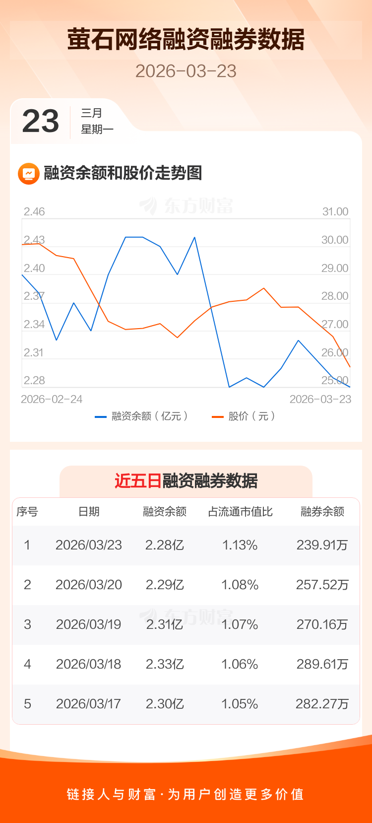交易所最新数据显示,萤石网络于2026年3月23日获融资买入1317.18万元,融资偿还1340.43万元,当日融资净偿还23.25万元。目前,该股融资余额2.28亿,占流通市值比例为1.13%。